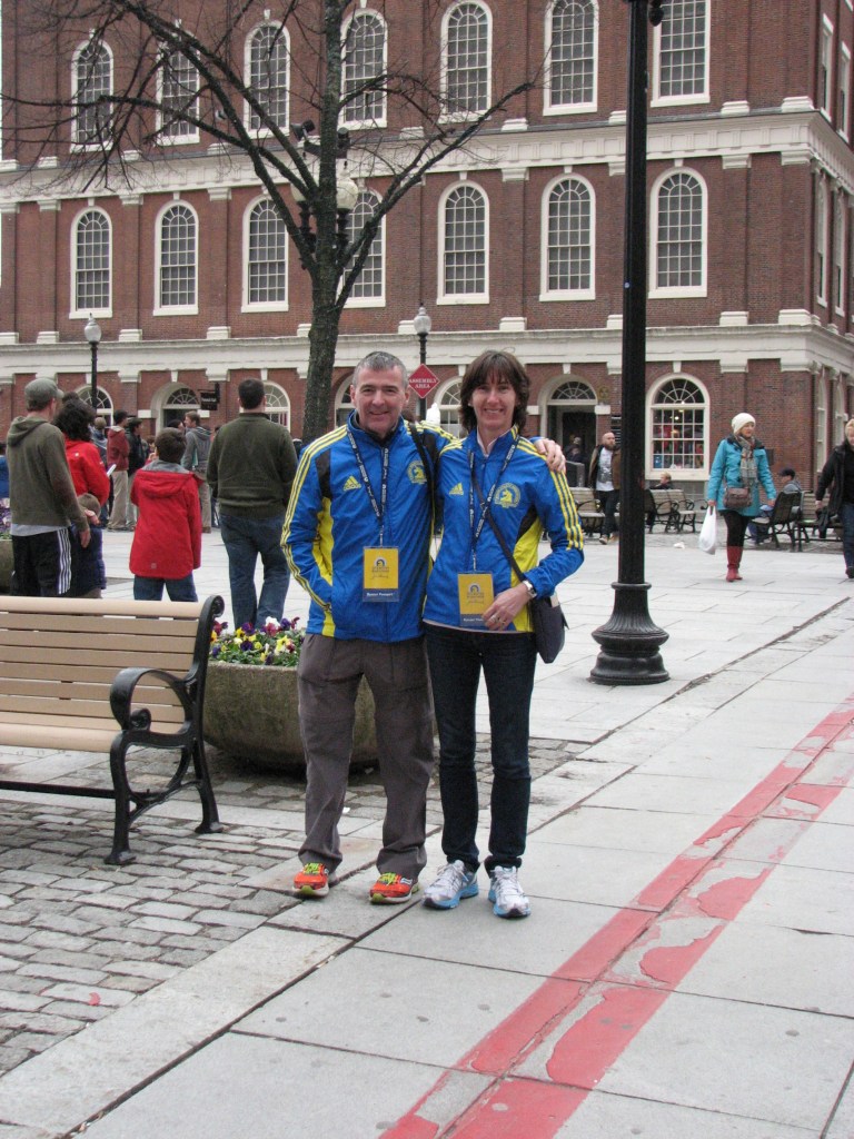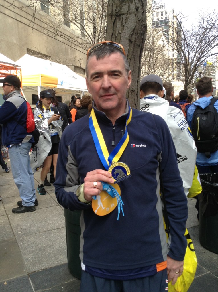 Claire followed in soon after. She’s a lovely elegant runner, great style, landing on her forefoot and making it look easy. She crossed the line in 3:34:52 and we found Tracey and Richard in the family reunion zone, quickly changed into warm gear and started walking back to the hotel and then all hell broke loose. We heard sirens all over the City but had no idea what was going on until we got back to the hotel and my mobile started going ballistic with text messages asking if we were okay. We received over 200 messages! Of course we had no idea why we were getting so many messages until we turned on the TV to hear the devastating news of the Boston bombings on the same Boylston that Claire and I had run along only an hour earlier.