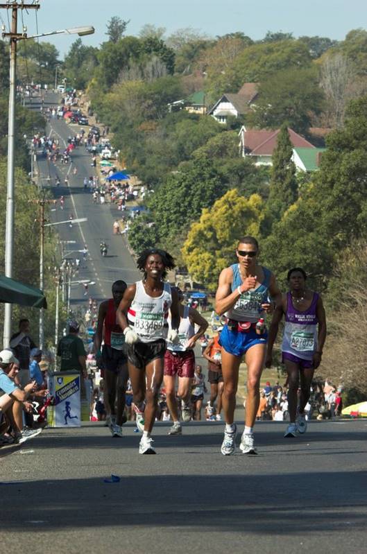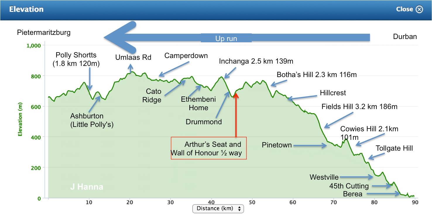 The race runs in different directions in alternate years. One year it runs from Durban to Pietermaritzburg, an up year, with approx. 6500 feet of climbing and 4000 feet of descent. Alternate years it runs the opposite way. Many commentators believe that the down year is tougher than the up. It certainly trashes runner’s quad muscles.